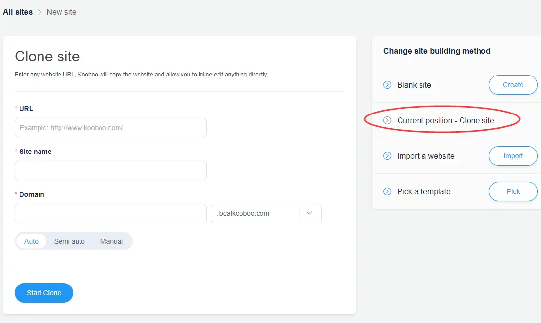 By choosing this option, you can enter any website URL into Kooboo. The platform will then clone the entire website, enabling you to perform inline editing on any element directly. Kooboo utilizes a unique deep copy technique that ensures over 95% of the cloned website remains identical to the original, while also making it faster and more efficient with just a few clicks.