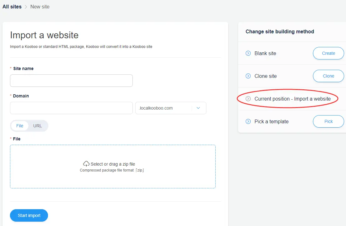 With this option, you can import a Kooboo package or a standard HTML package into Kooboo. The platform will automatically convert it into a Kooboo site, allowing you to work with the imported content. You have the flexibility to import a zip file containing static HTML code or packages exported from Kooboo.