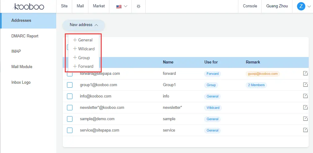 With Kooboo, users can manage multiple domains and addresses effortlessly. Each user account is associated with a unique Mail account, and domains are organized based on the user'organization. By default, users can create unlimited email addresses across unlimited domains, all of which share a common Inbox.