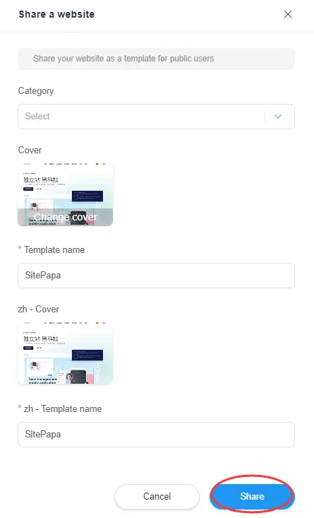 In the information page that appears, fill in the desired details and screenshots, then click "Share" to proceed.