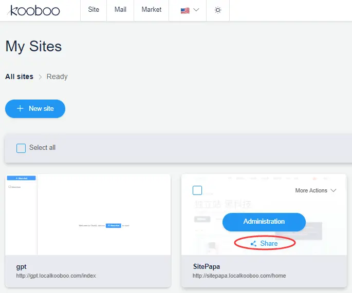 To share a website or application with the community, hover over the desired site and select "Share" from the appearing menu.