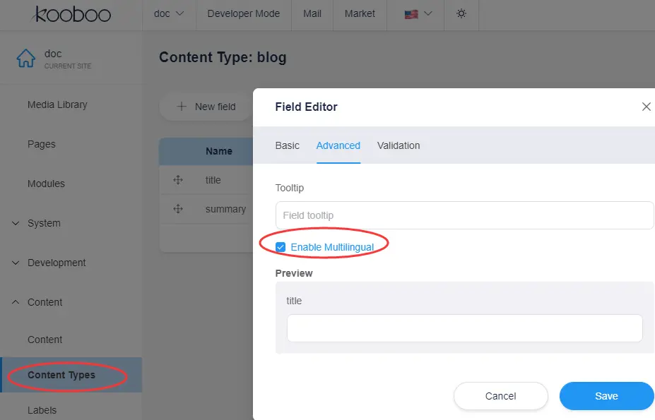When a user enables Multilingual on their website, they can find an option for "Enable Multilingual" in the field interface of the content types.