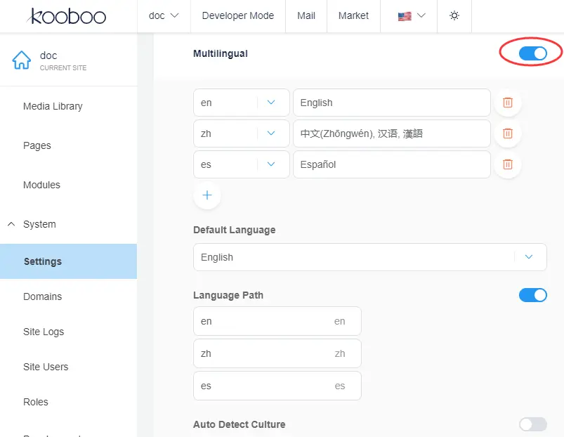 Navigate to "System" > "Settings" in the Kooboo CMS, Find the "Multilingual" option.