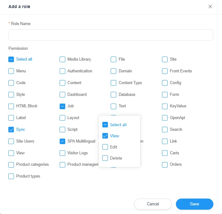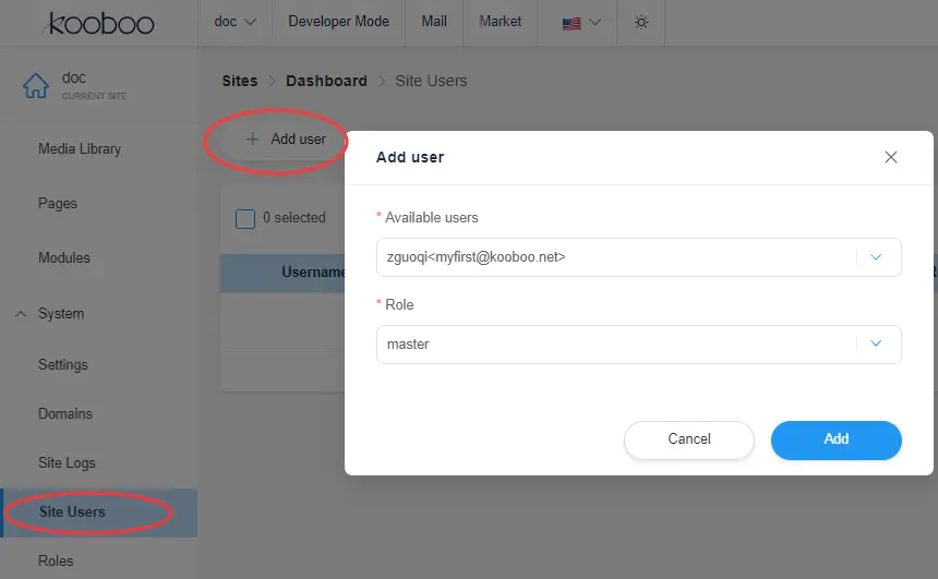 Once a role is created, you can assign users with specific roles to a website. Please note that only users from the same organization are available to be added to a site