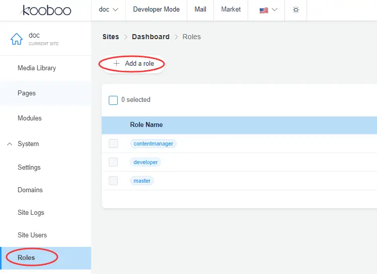 Kooboo operates as a multi-user system. To create a role, navigate to "System" and select "Roles". Click on "Add a role" to create a new role.