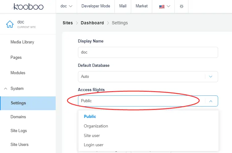 In addition to the CMS access settings, users can also configure different access rights for public access to the website.