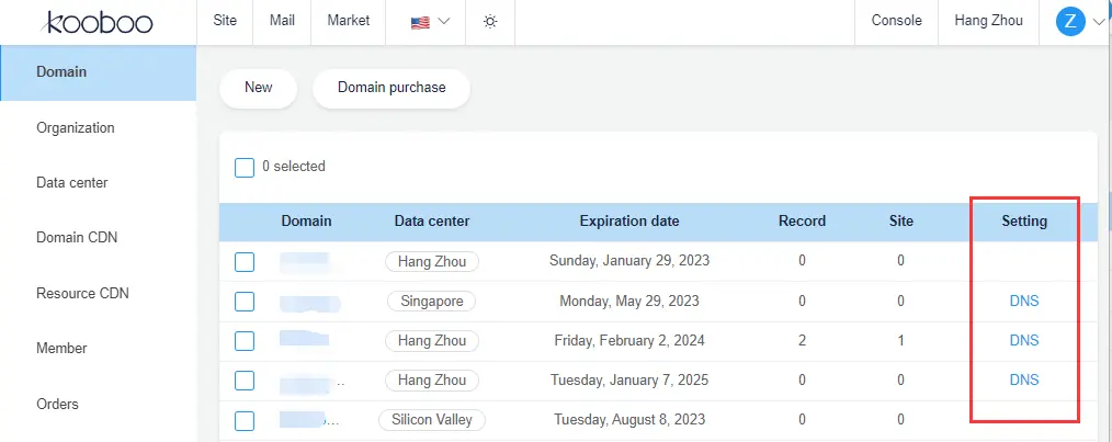 If a domain name is using Kooboo's DNS server, there will be a DNS record entry in the domain management interface.