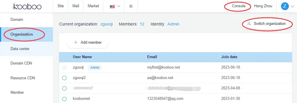To manage your organization, click on "Console" in the top right corner and select "Organization" from the menu on the left side.