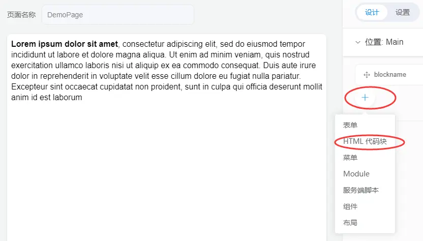 - 点击位置下方的"+" 按键, 选择HTML代码块