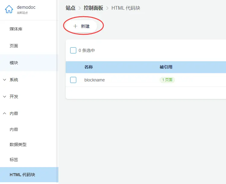 - 点击 “新建”, 创建新的HTML代码块
