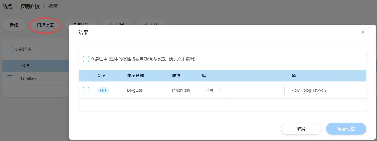 - 点击 “扫描标签”, 会扫出网站可能可以做为标签的代码部分