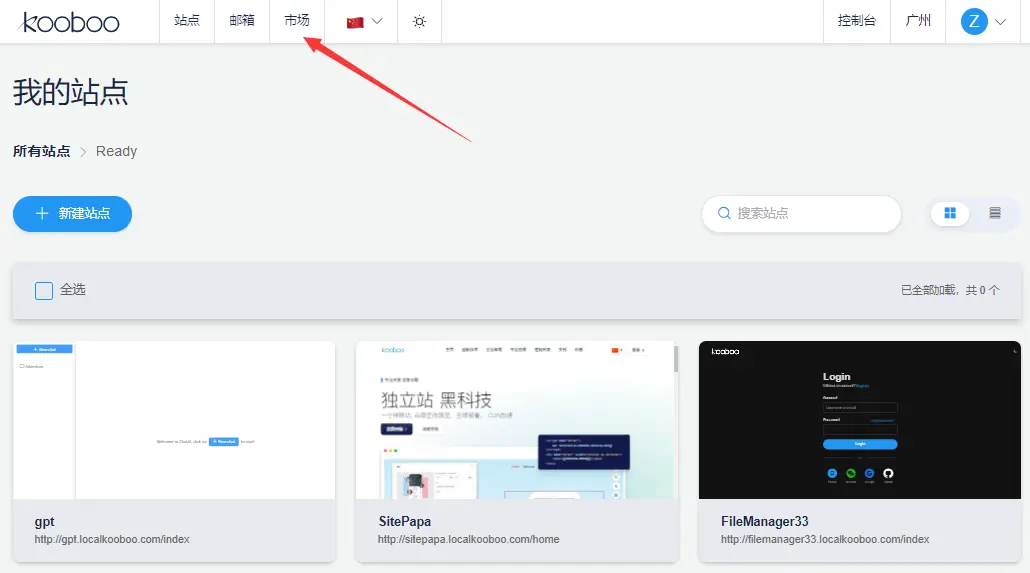 入口在系统后台的大部分地方, 都可以在上方找到一个市场的入口