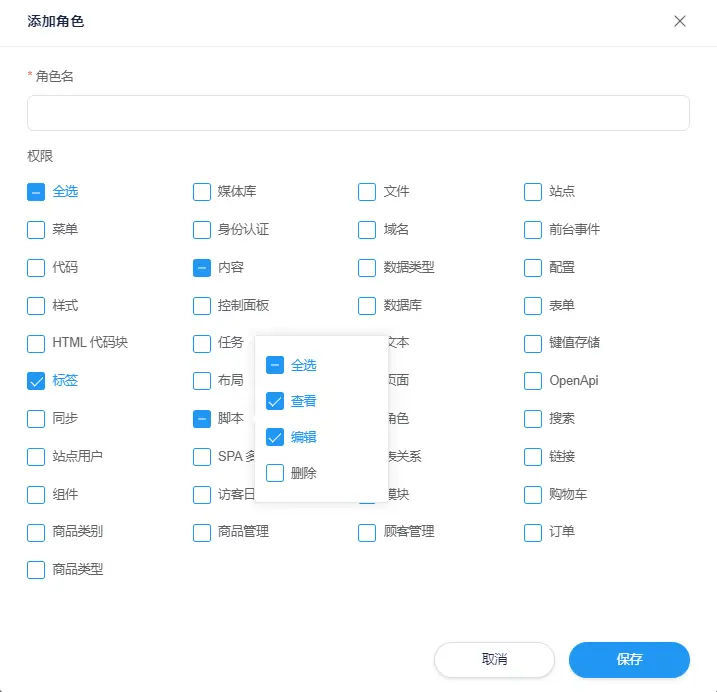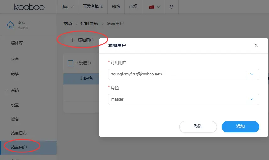 添加完角色后就可以给站点指定允许访问CMS的用户, 供选择的用户是本组织下的用户