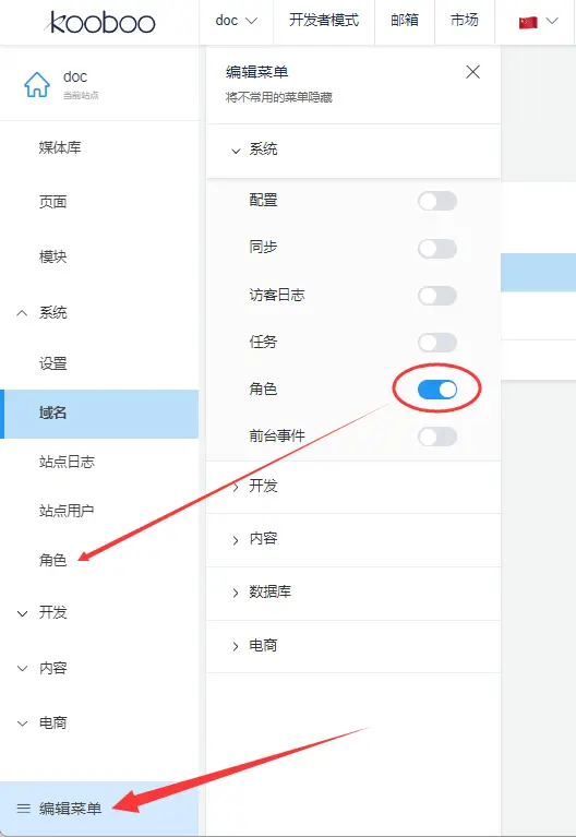 当用户新建网站时, 系统会初始化常见的网站操作菜单, 用户可以在左下角找到“编辑菜单”选项, 点击打开编辑菜单界面, 用户可以激活新菜单
